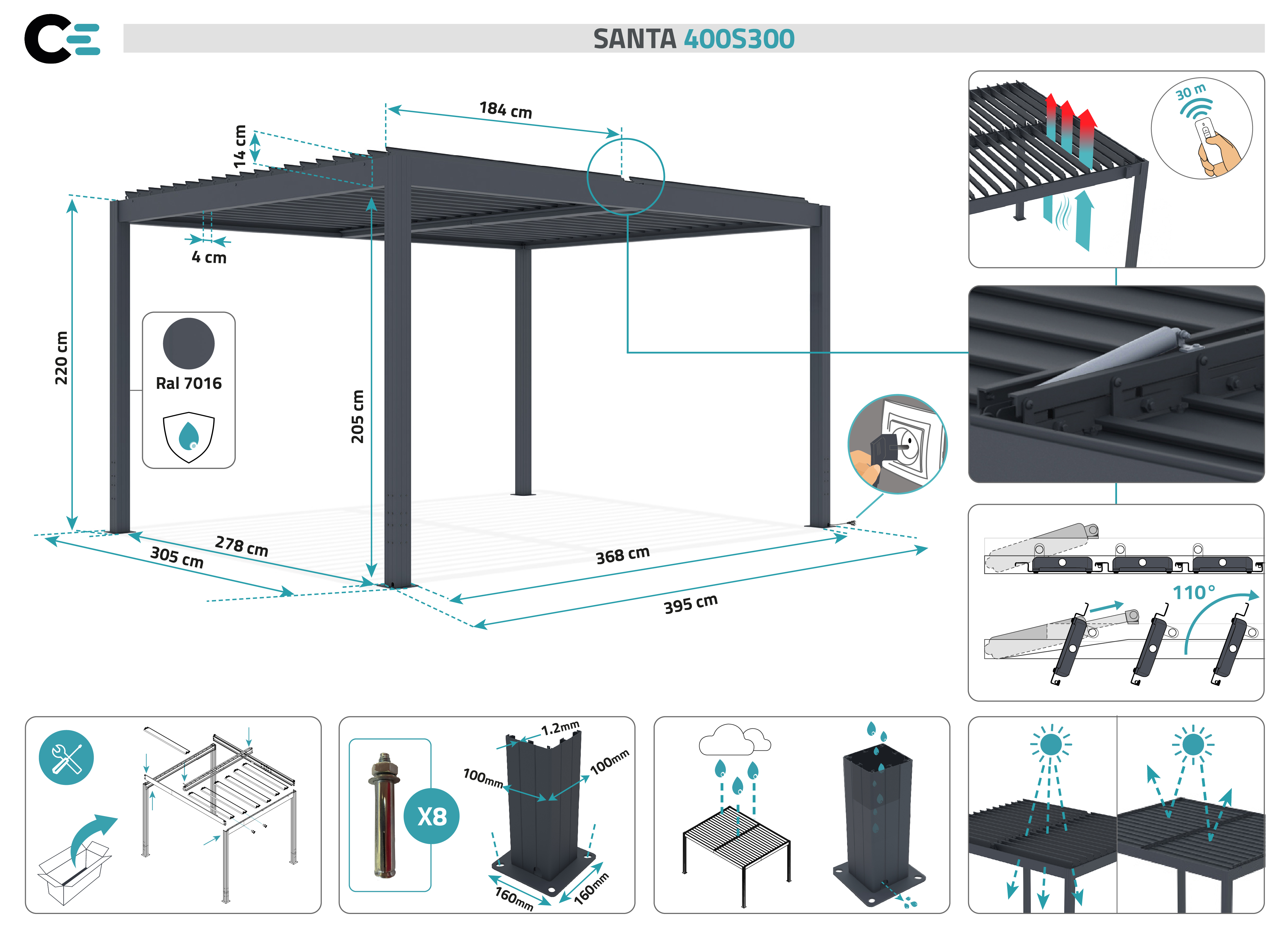 Die SANTA Pergola verfügt über ein vollautomatisches, verstellbares Stahllamellensystem, mit dem Sie Sonnenlicht und Belüftung mit nur einem Klick regulieren können. Mit einer intuitiven Fernbedienung können Sie den Lamellenwinkel ganz einfach um bis zu 110 Grad einstellen und in Sekundenschnelle von vollständigem Schatten auf erhöhte Helligkeit umschalten. Die fest im Boden verankerte Pergola garantiert perfekte Stabilität und eine dauerhafte Installation, ideal für alle Witterungsbedingungen. Sie hält Windgeschwindigkeiten von bis zu 60 km/h stand und gewährleistet so Stabilität und Sicherheit auch bei starkem Wind. Die Pergola aus Aluminium und Stahl: eine elegante und langlebige Konstruktion